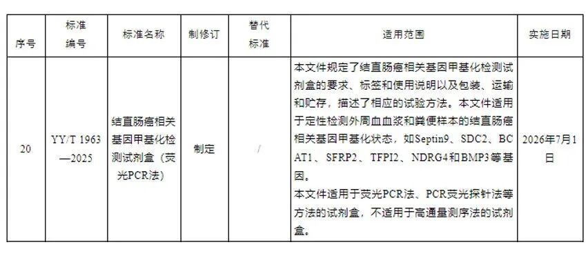 YY/T 1963-2025针对结直肠癌相关基因甲基化检测试剂盒的要求、标签和使用说明以及包装、运输和贮存、试验方法进行了系统规定,适用于定性检测外周血血浆等样本的结直肠癌相关基因甲基化状态(Septin9基因等)。该标准的实施将推动IVD行业甲基化检测领域向“质量竞争”转型,促进行业高质量发展。