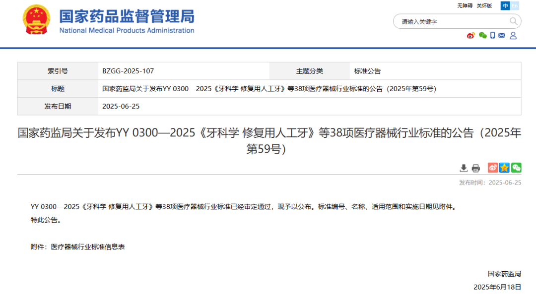 2025年6月,国家药品监督管理局(NMPA)发布标准公告(2025年第59号),公布38项医疗器械行业标准已经审定通过,并于2026年7月1日起陆续正式实施。