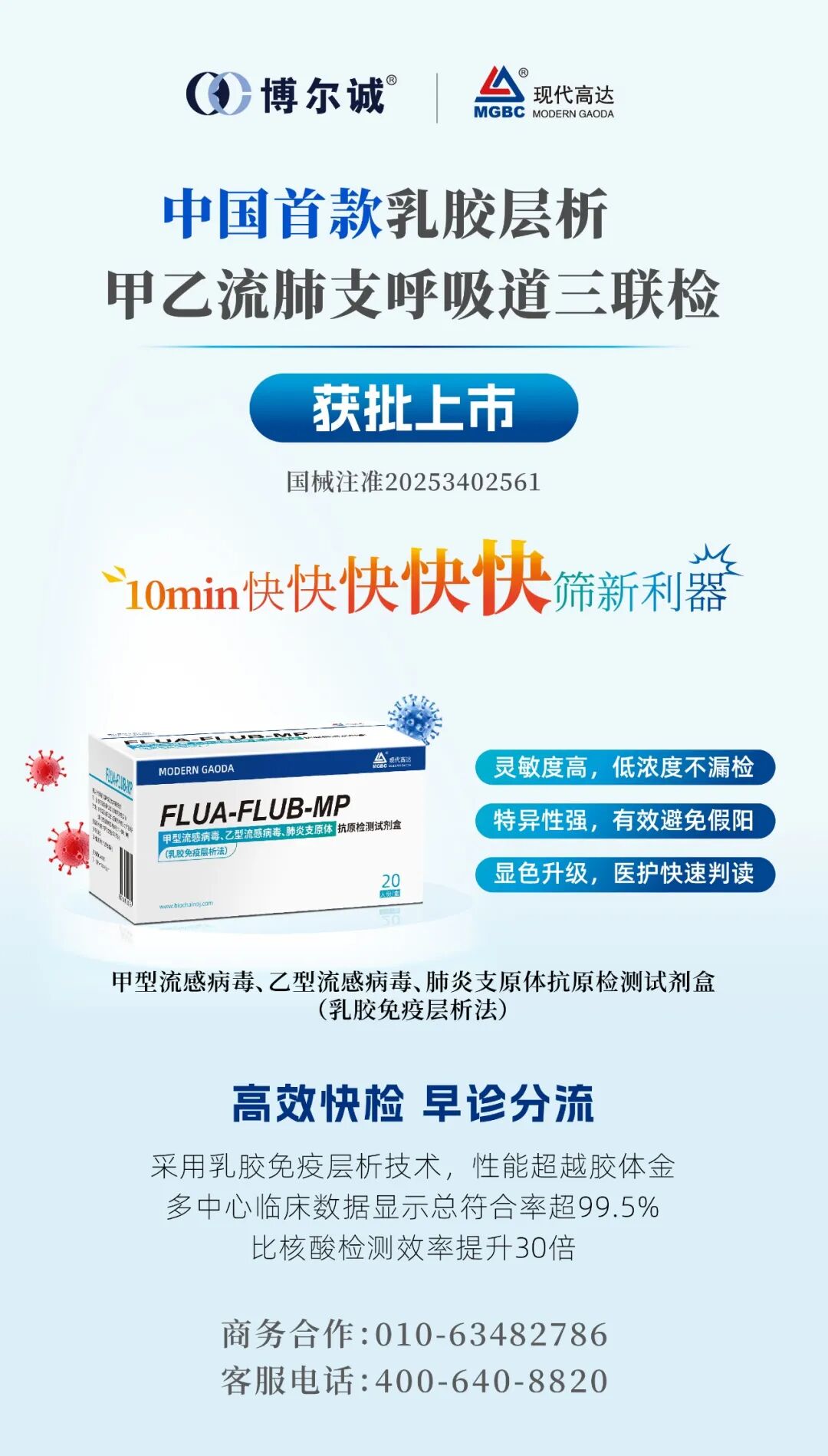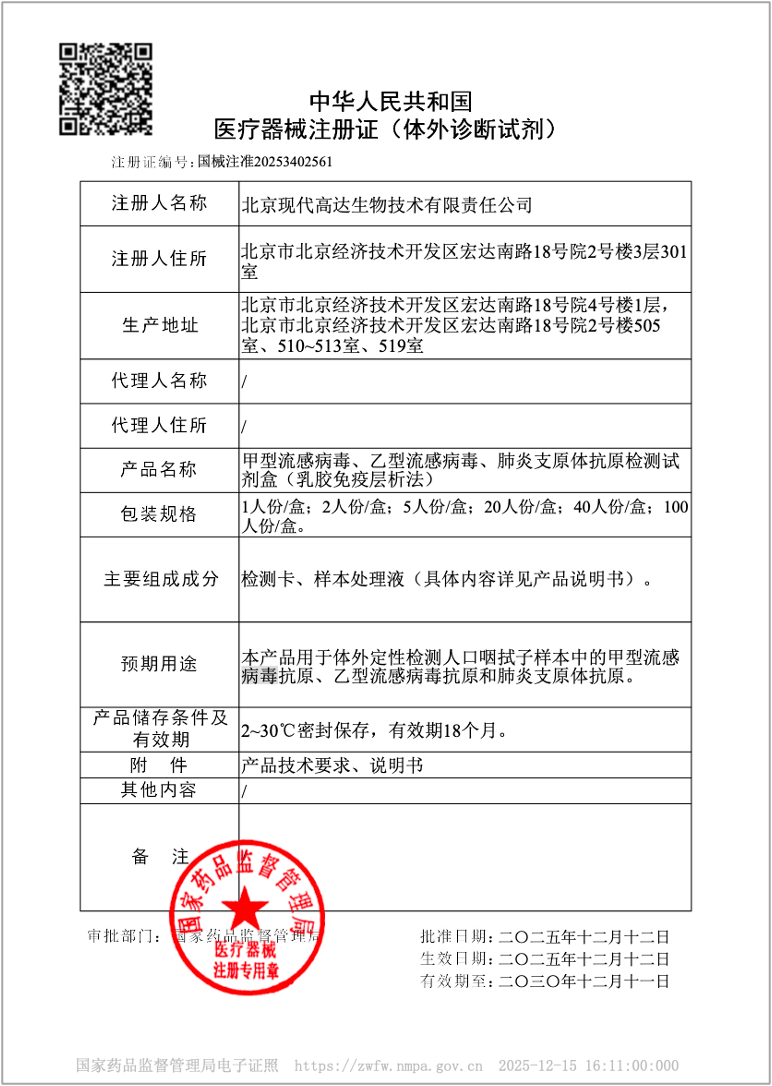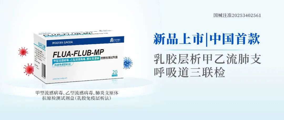 2025年12月12日,博尔诚全资子公司现代高达自主研发的甲型流感病毒、乙型流感病毒、肺炎支原体抗原检测试剂盒(乳胶免疫层析法)获批上市(以下简称“甲乙流肺支三联检”),是国内首款采用乳胶免疫层析技术的甲乙流肺支三联检产品。