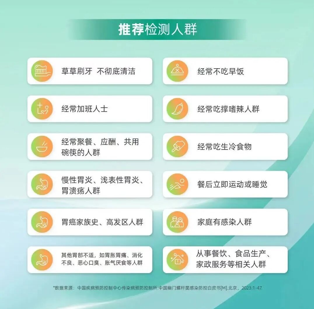 需要注意的是,存在以下任何一种情况的人群,建议尽快进行幽门螺旋杆菌抗原(HP-Ag)检测,排查是否存在HP感染。